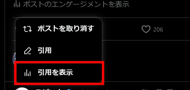 - 表示されるメニューから「引用ツイート」を選択します。